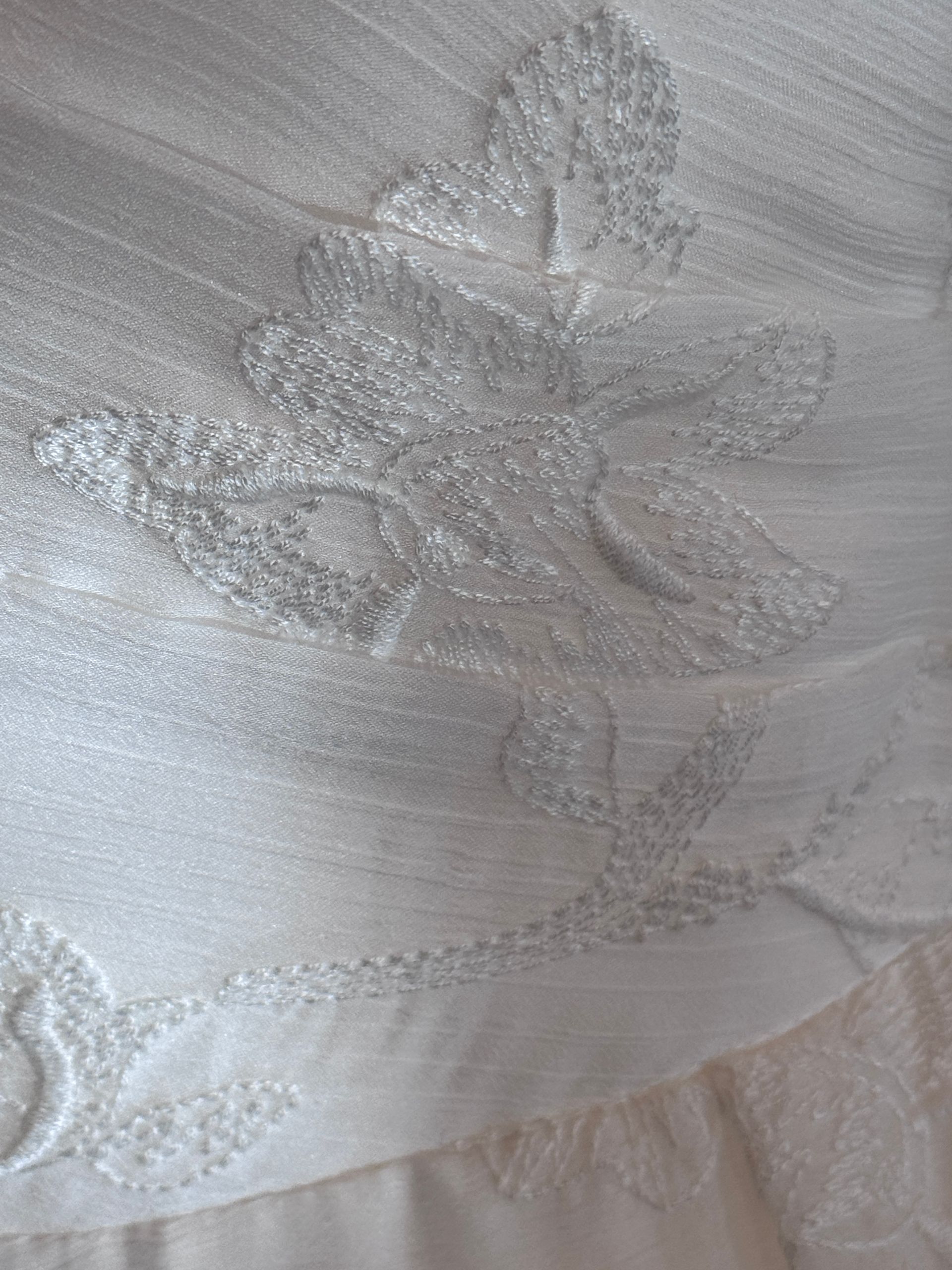 Soft A-line gown featuring embroidered grain chiffon and detachable chiffon tulip sleeves.