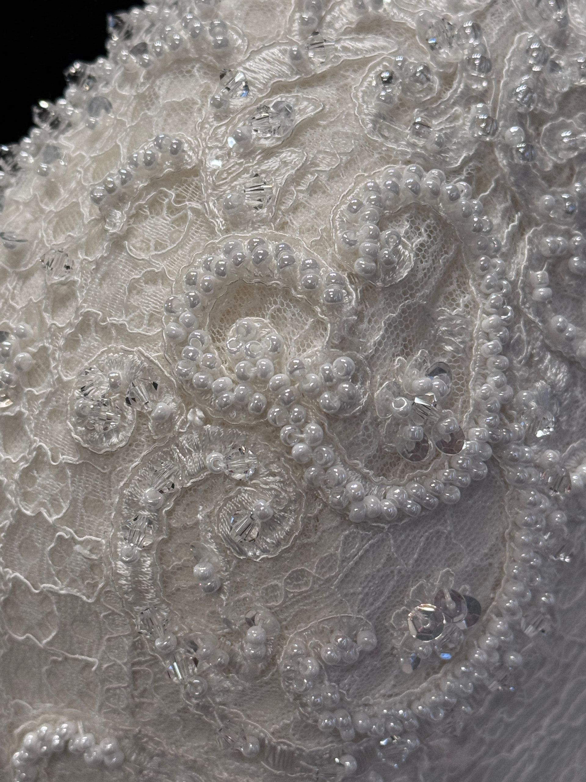Fit and flare crepe gown with corded Alencon lace bodice and train.