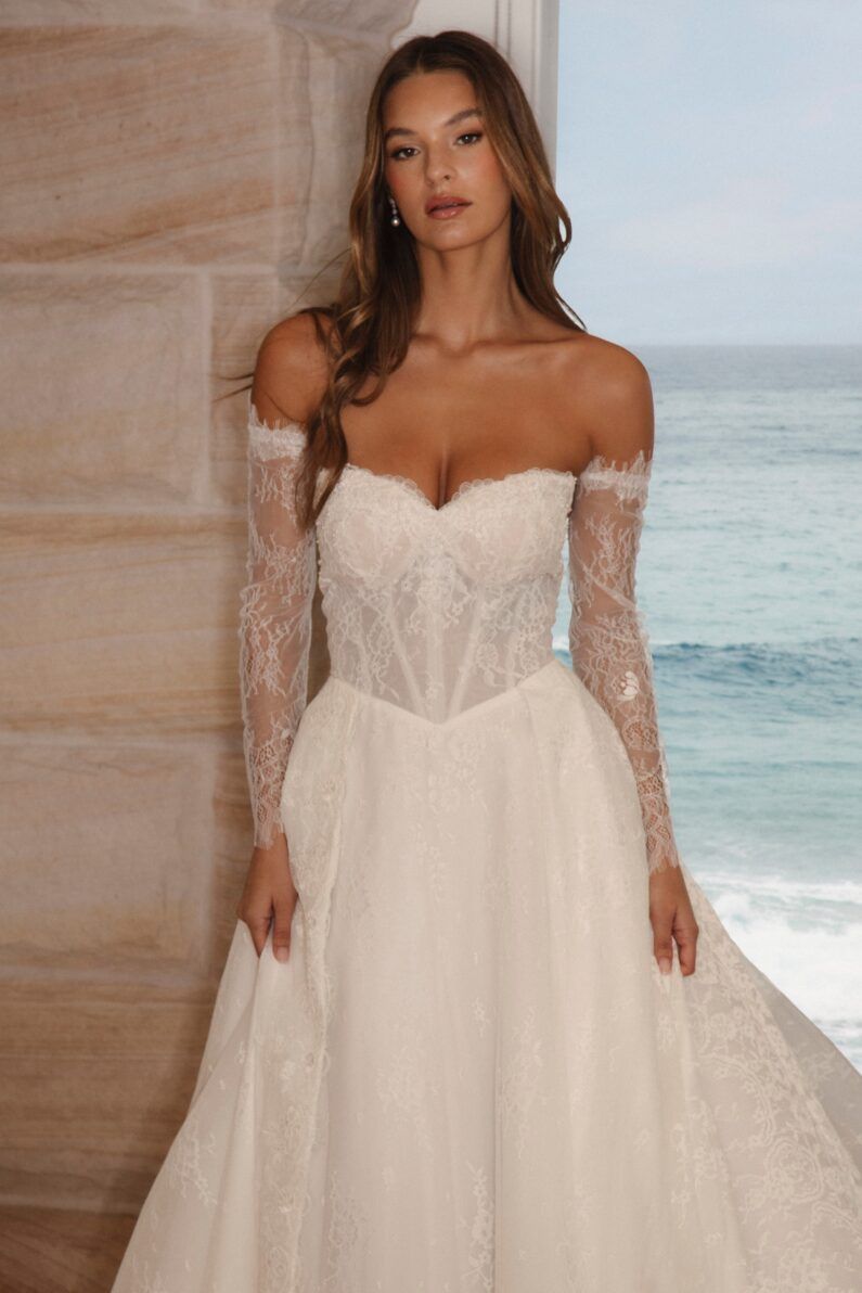 Lace bridal sleeves, with eyelash lace and corded lace detailing at the top and at the cuff.