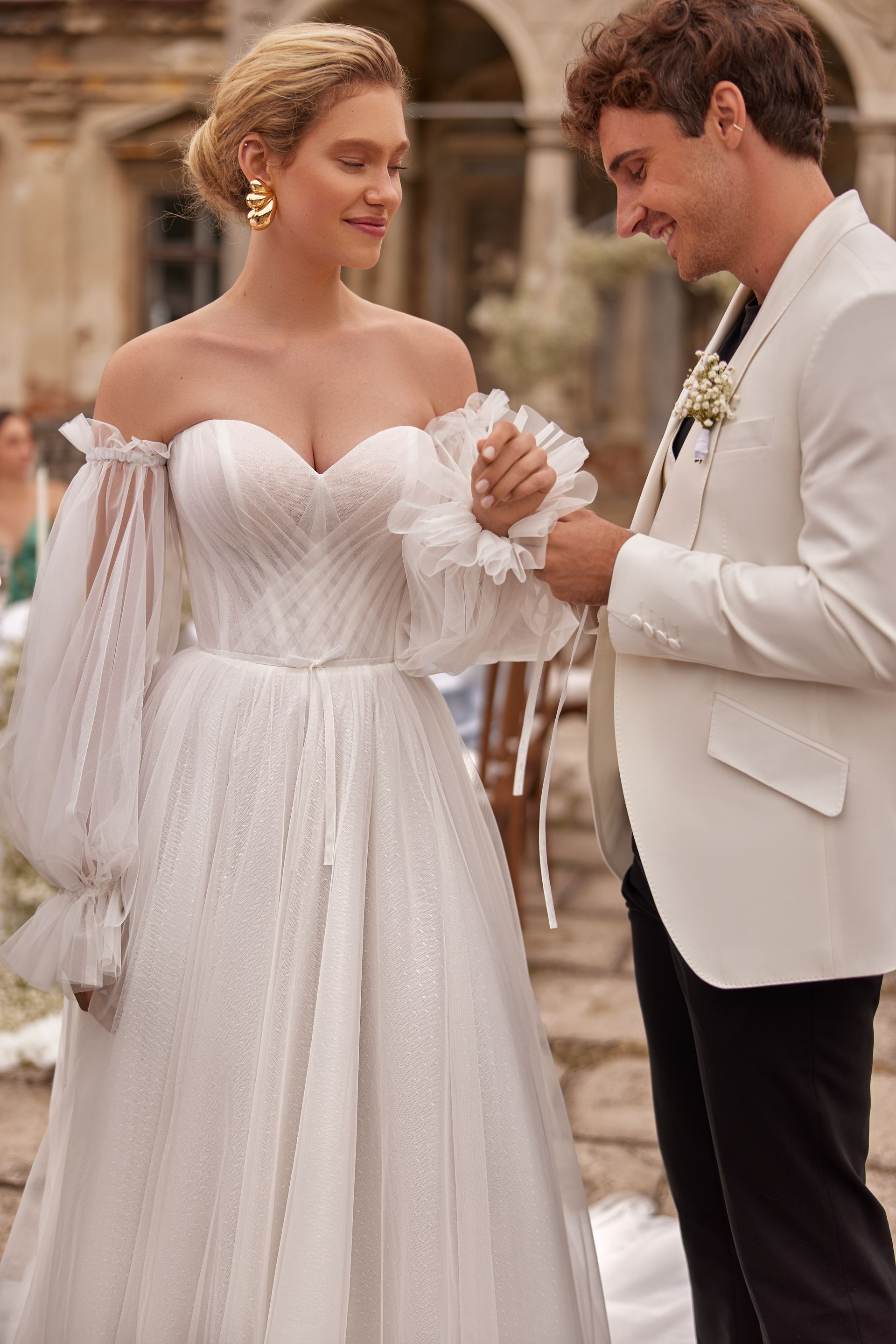 A-line dress with semi-transparent draped bodice, detachable sleeves and corset back.