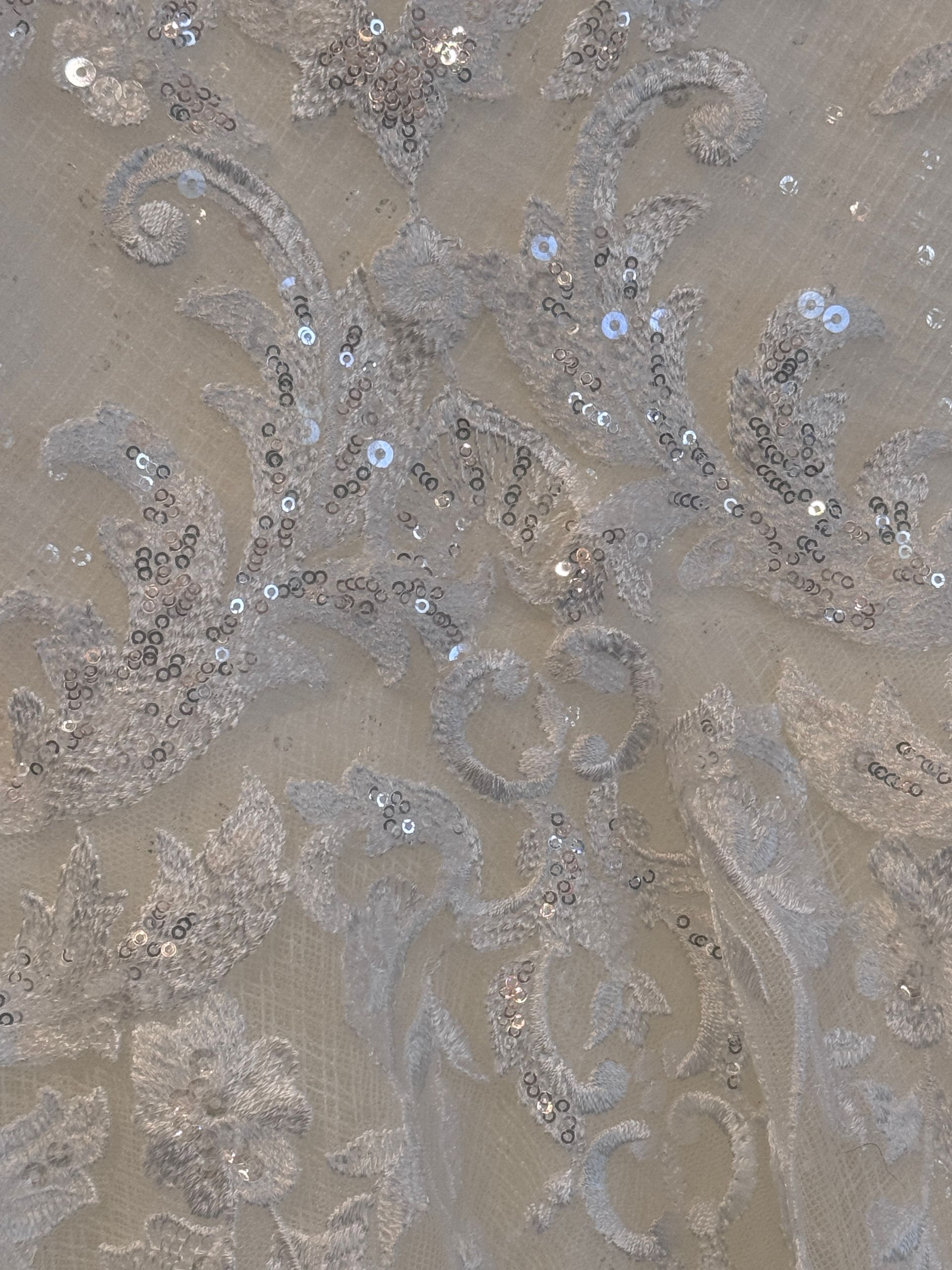 Beaded detachable straps on this embroidered cotton lace gown featuring fishnet tulle, sequinned tulle and English net.
