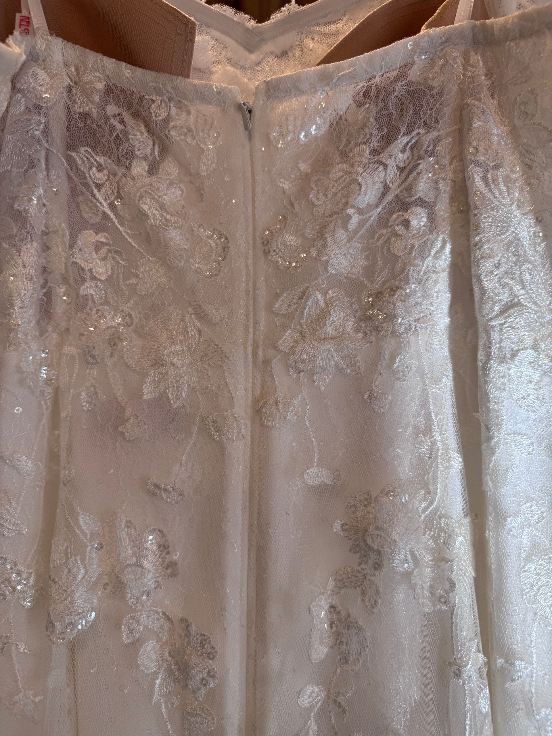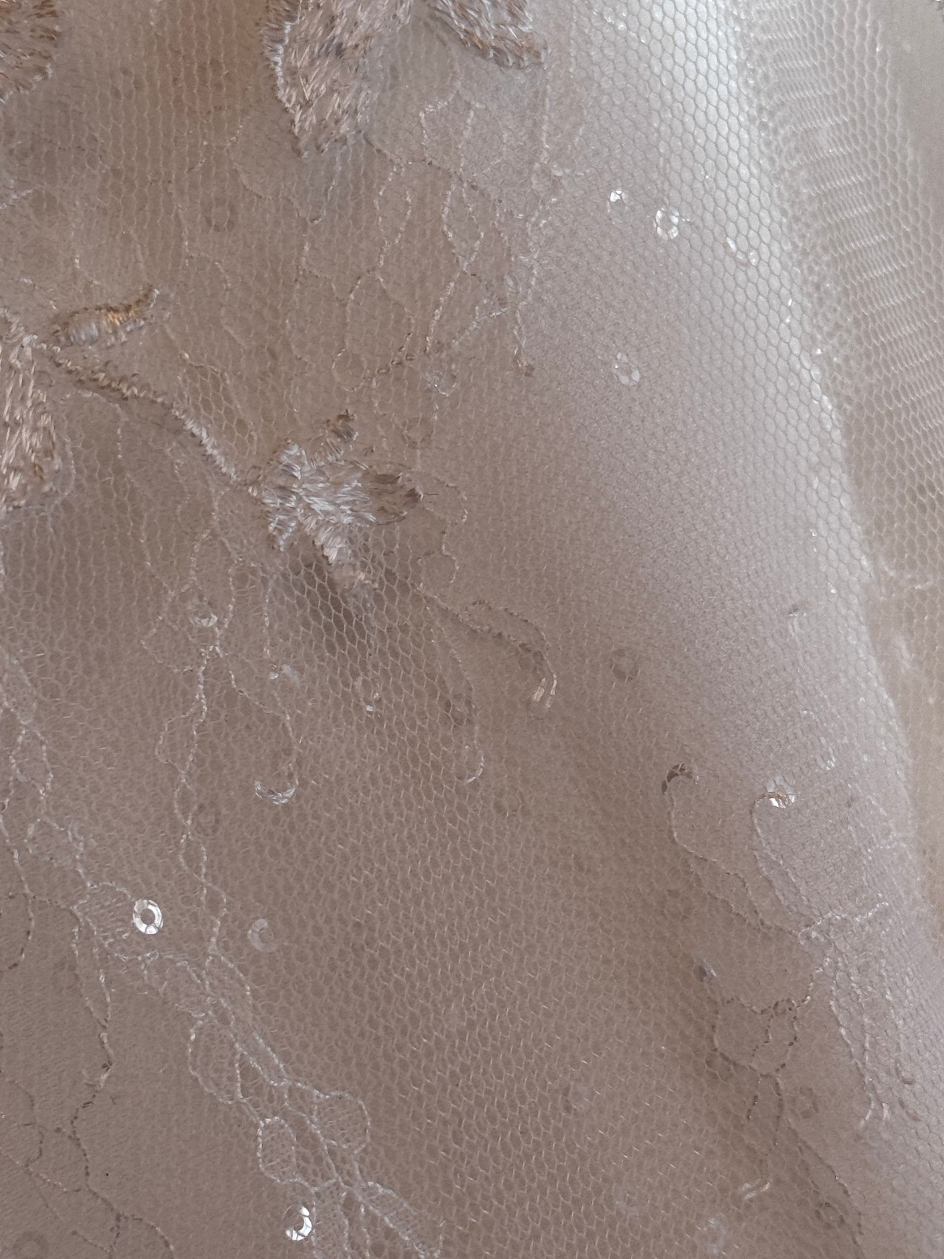 Chantilly lace and tulle fit and flare gown with a hint of sparkle, the bodice adorned with lace appliques and detachable frill sleeves.