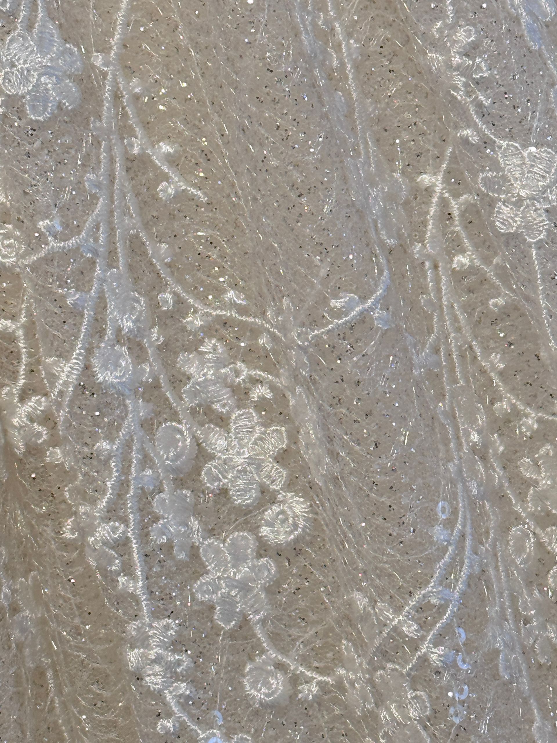 Exposed boning corseted ball gown, with the boning giving structure to the dimensional romantic blooms, with lace and sparkle tulle.