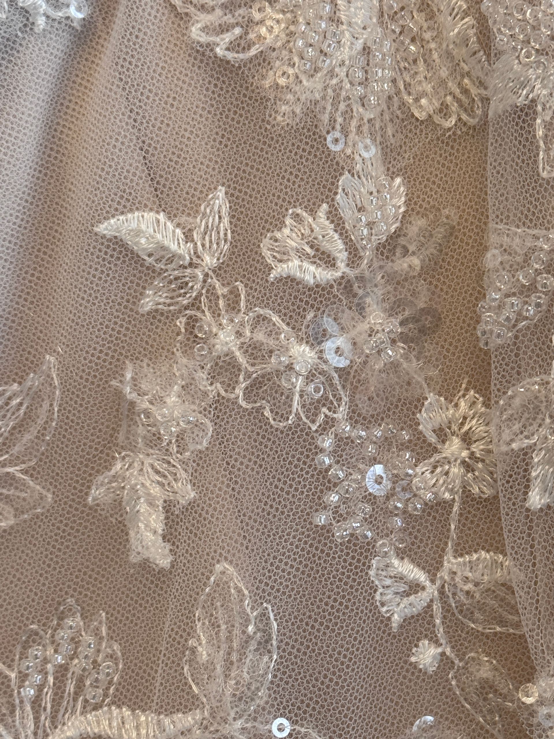 Fit and flare gown with top to toe beaded lace, plunging neckline and illusion bodice.