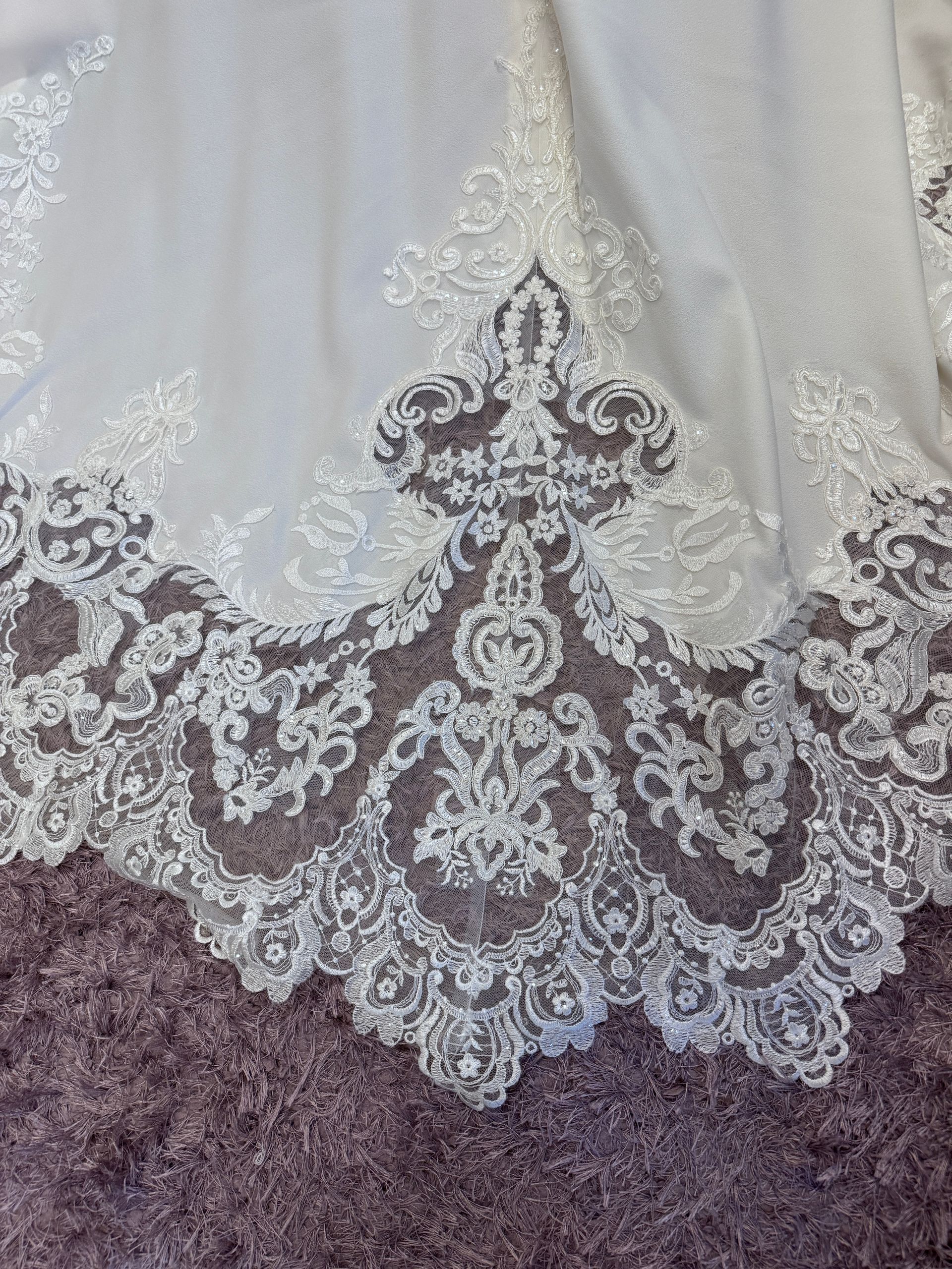 Fit and flare crepe gown with corded Alencon lace bodice and train.