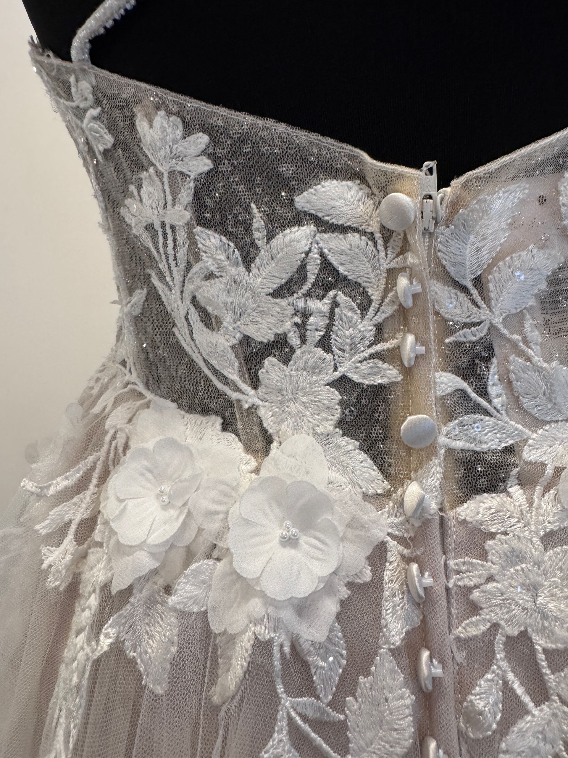 Adorned with dimensional blossoms and sparkle, this tulle gown features an A-line silhouette and subtle train.