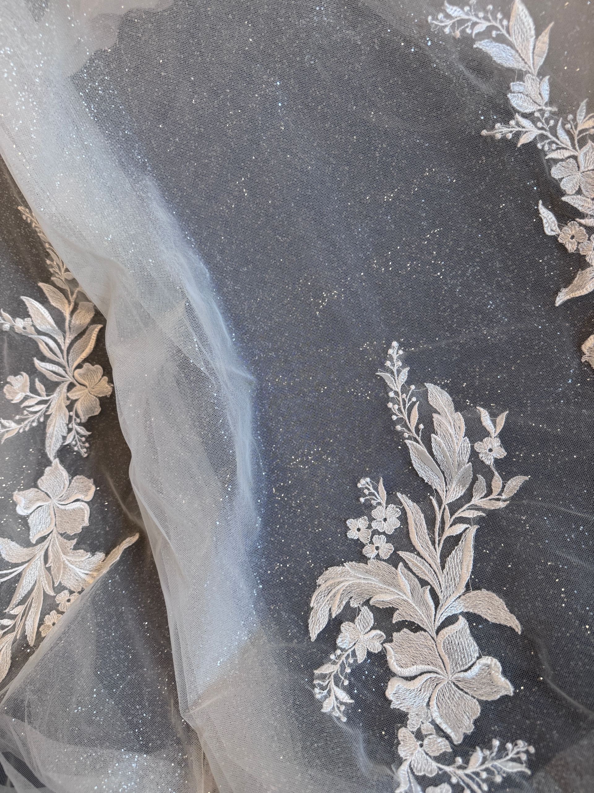 Botanical mermaid gown with an illusion neckline and open back with floral embroidered lace over sparkle net.