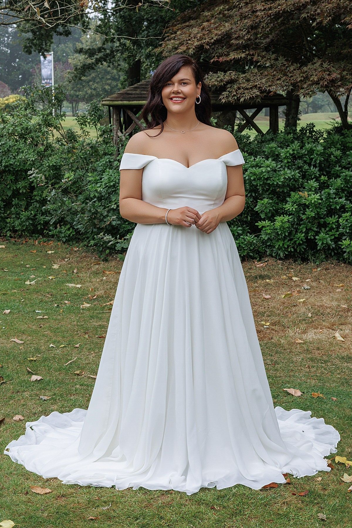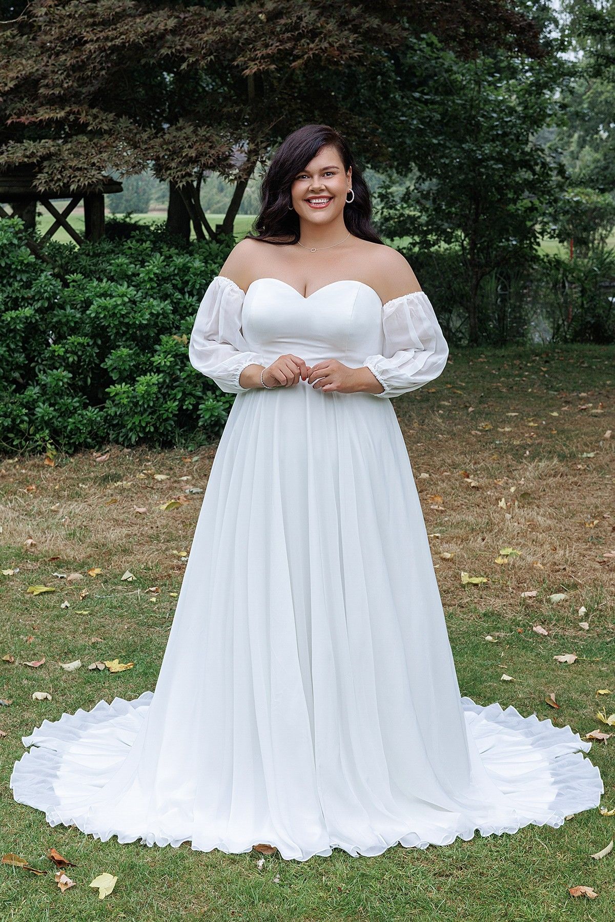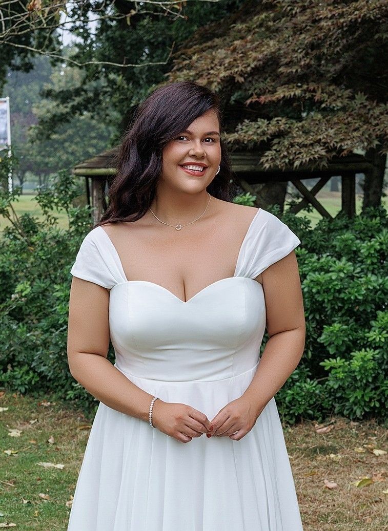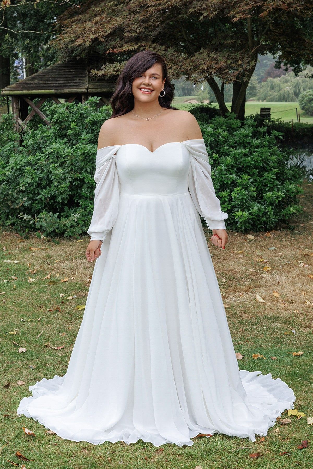 Available to re-order in for purchase in sizes 16-32, in ivory with corset or zip back and optional additional sleeves.