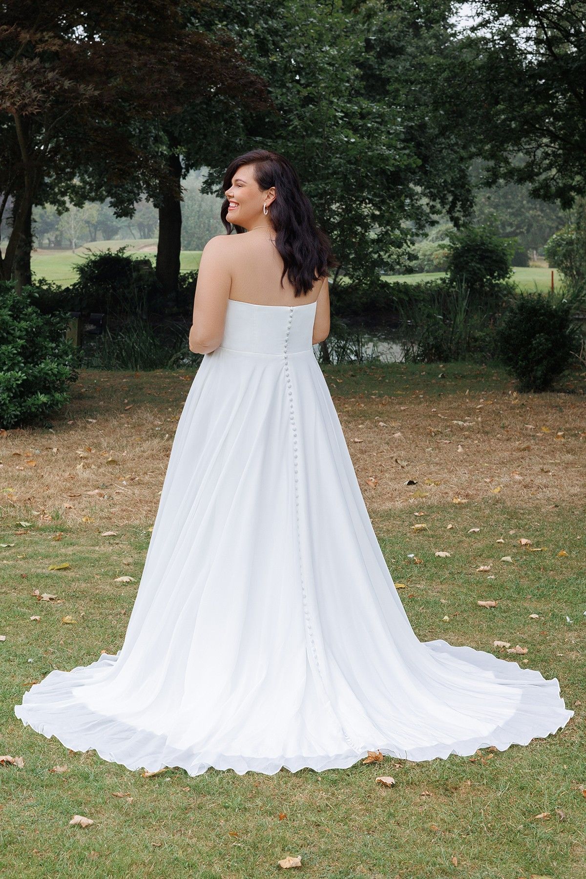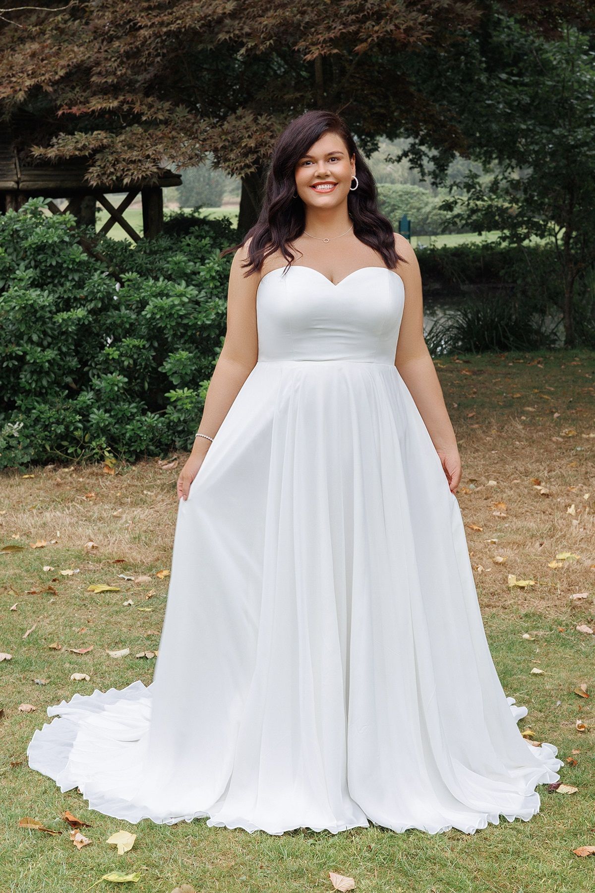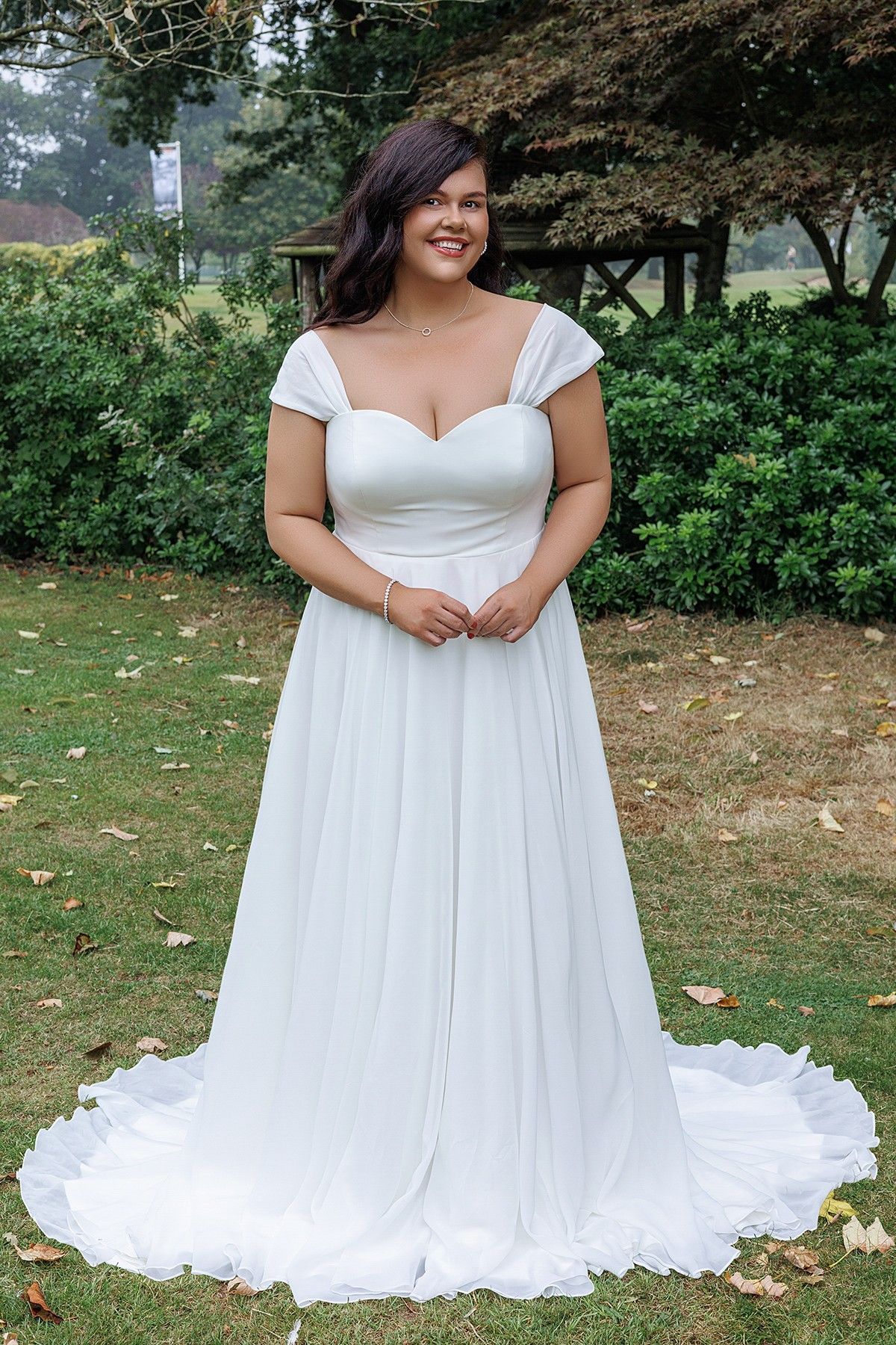 Available to re-order in for purchase in sizes 16-32, in ivory with corset or zip back and optional additional sleeves.