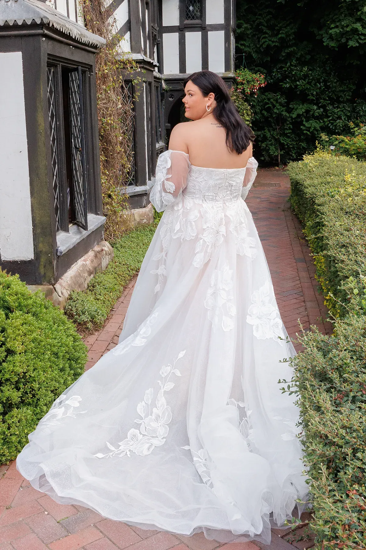 Available to re-order in for purchase in sizes 16-32, in ivory/blush with corset or zip back.