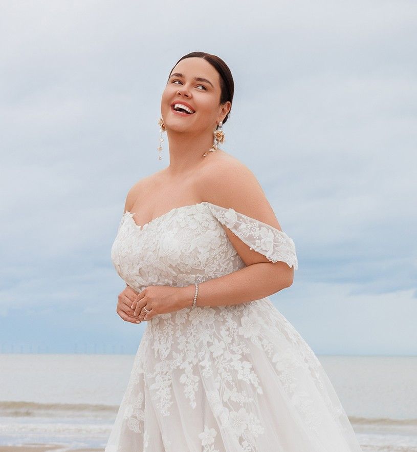 Available to re-order in for purchase in sizes 16-32, in ivory/stone or ivory with corset or zip back.
