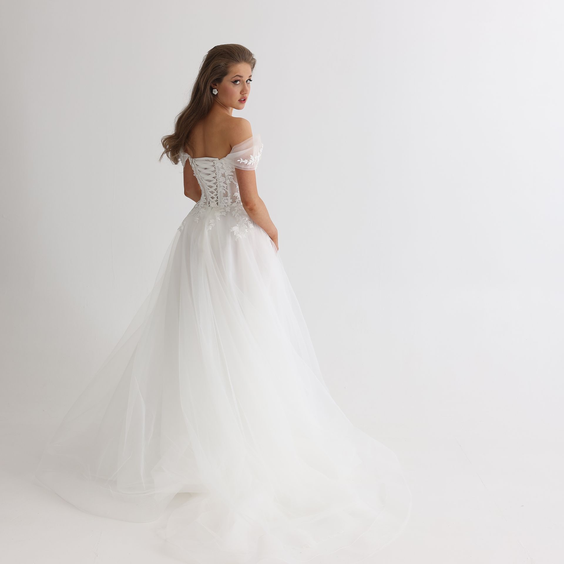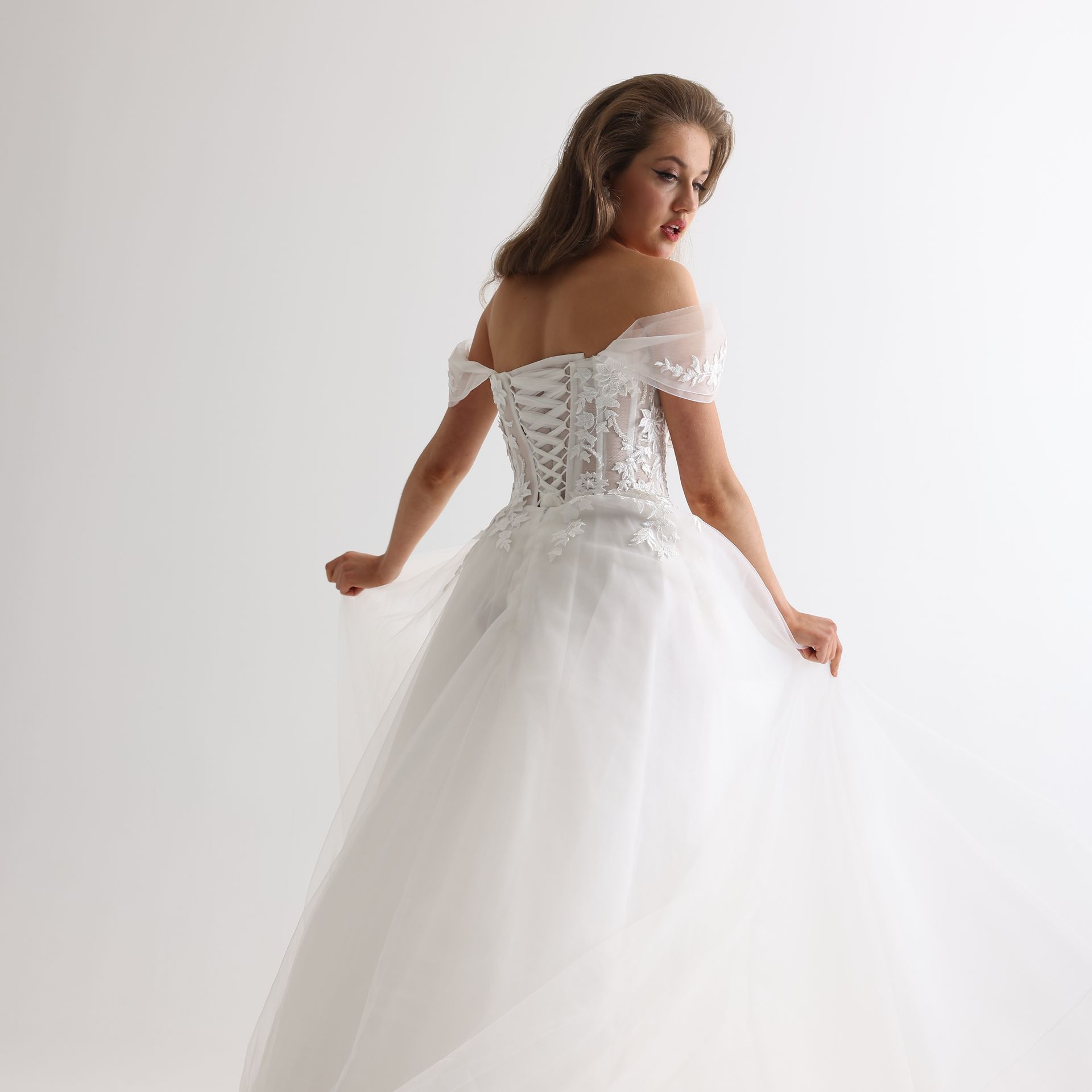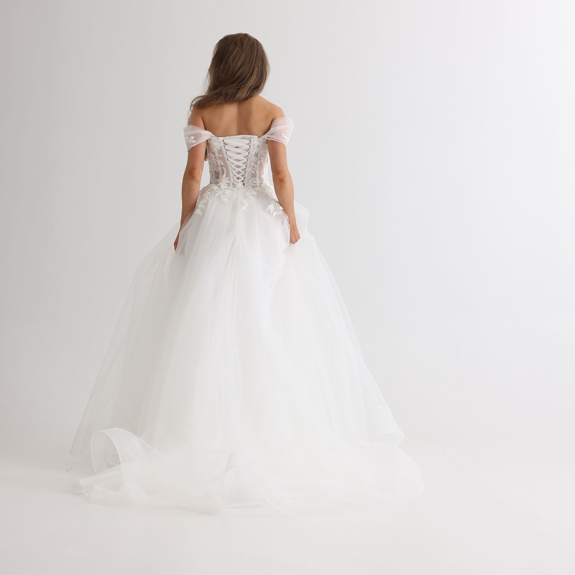 Lace embroidered with handmade beads A-line gown with off the shoulder straps and corset back.