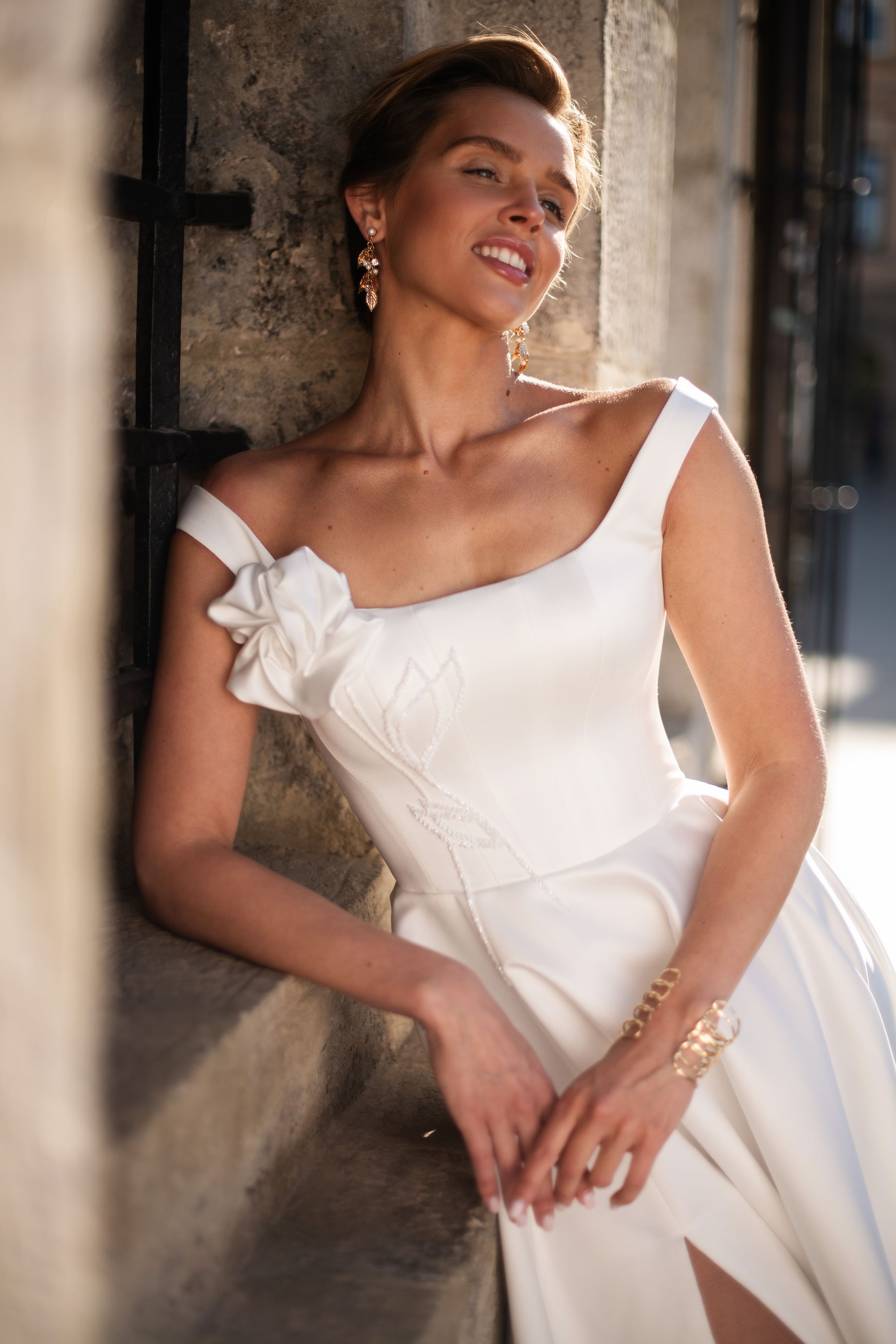 Satin A-line dress with hand embroidered detailing and flower on the bodice, slit in skirt and corset back.