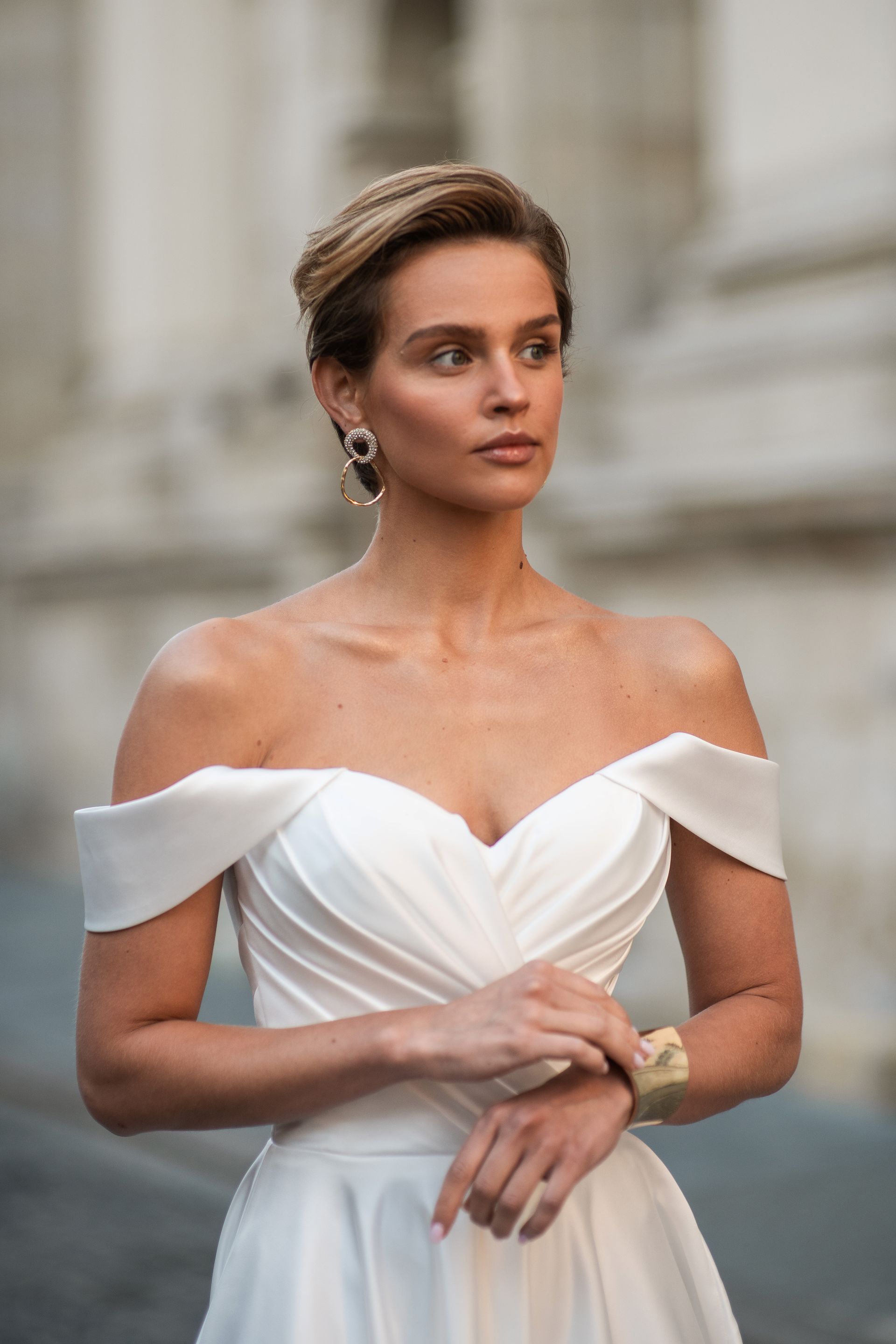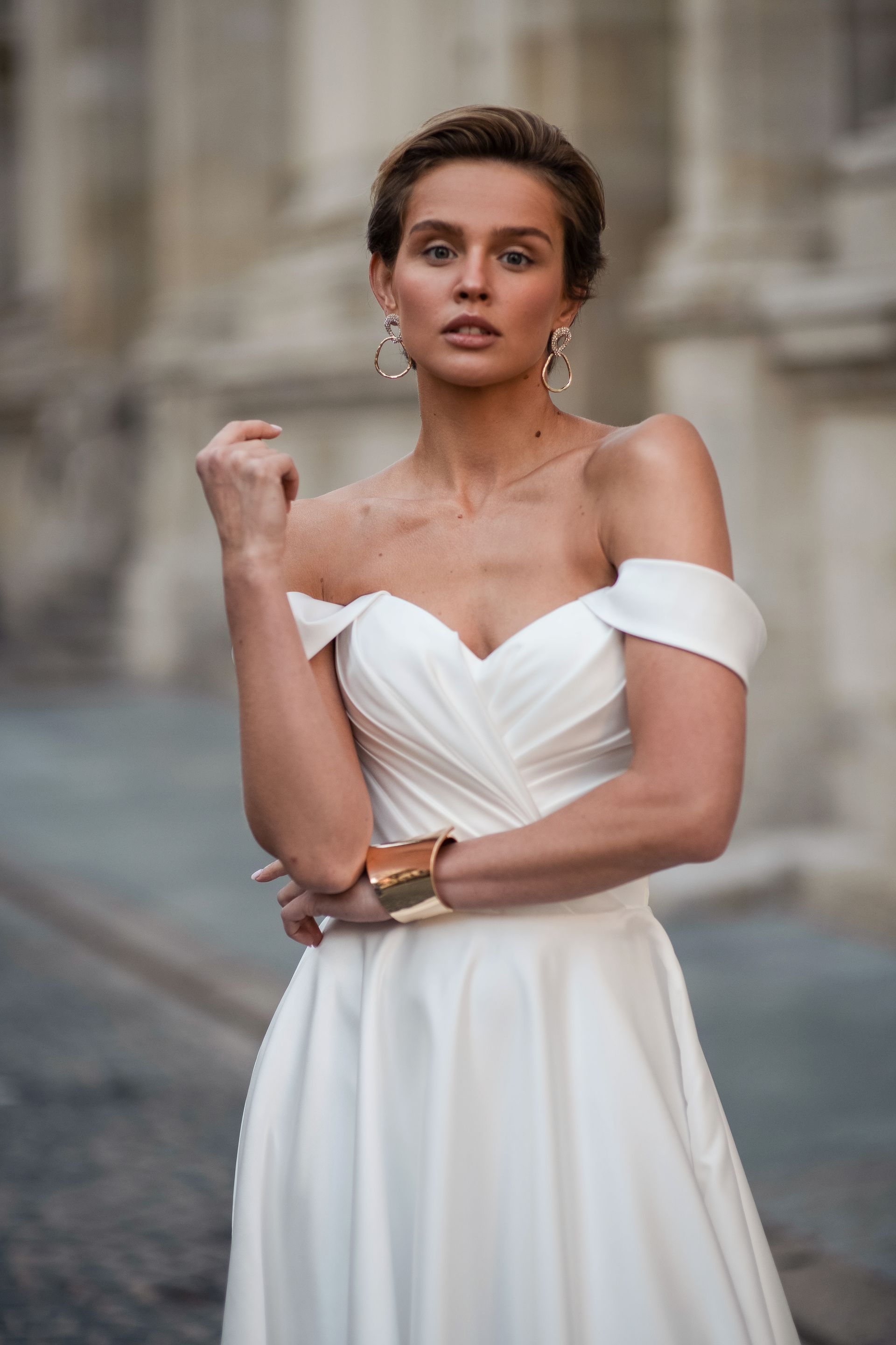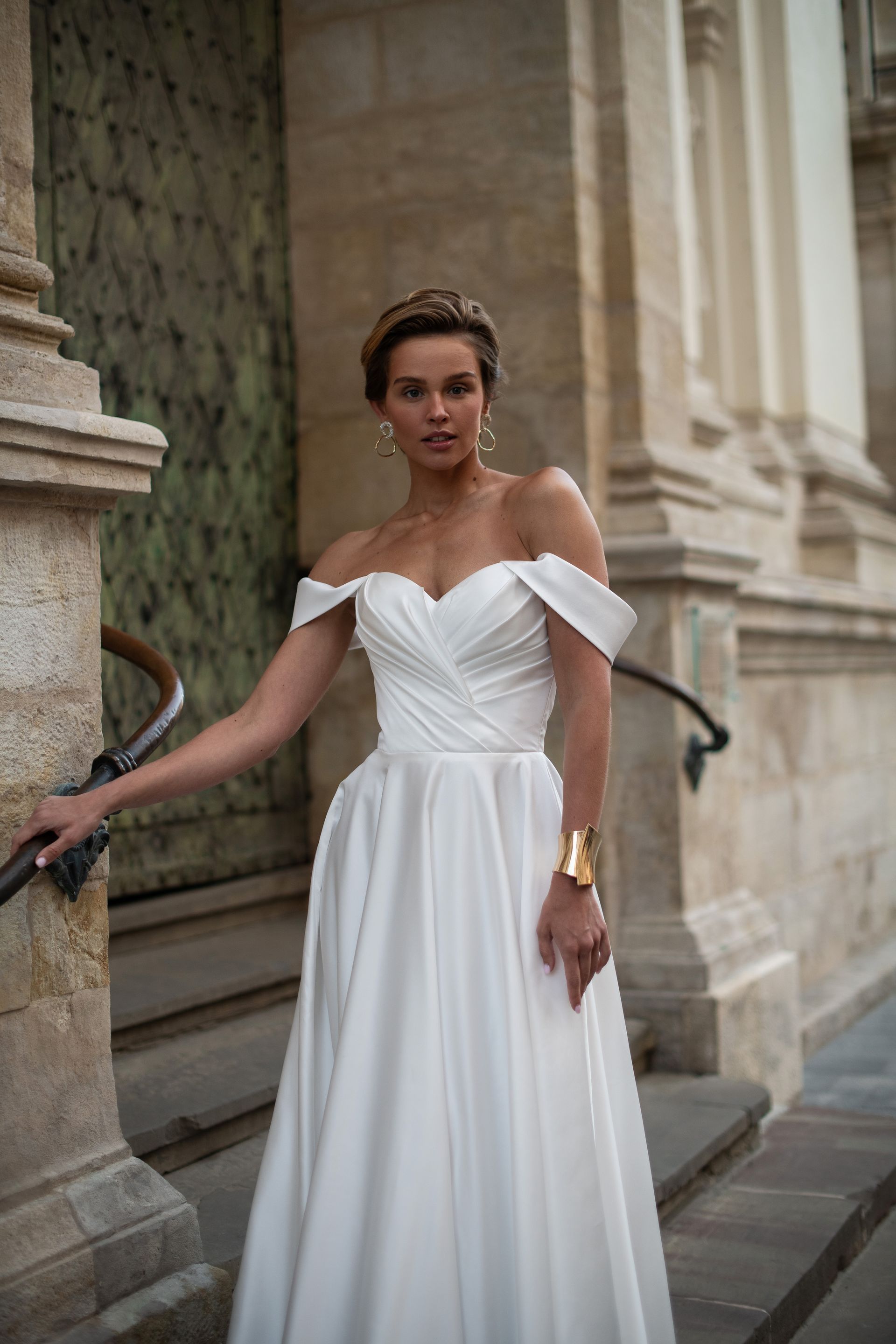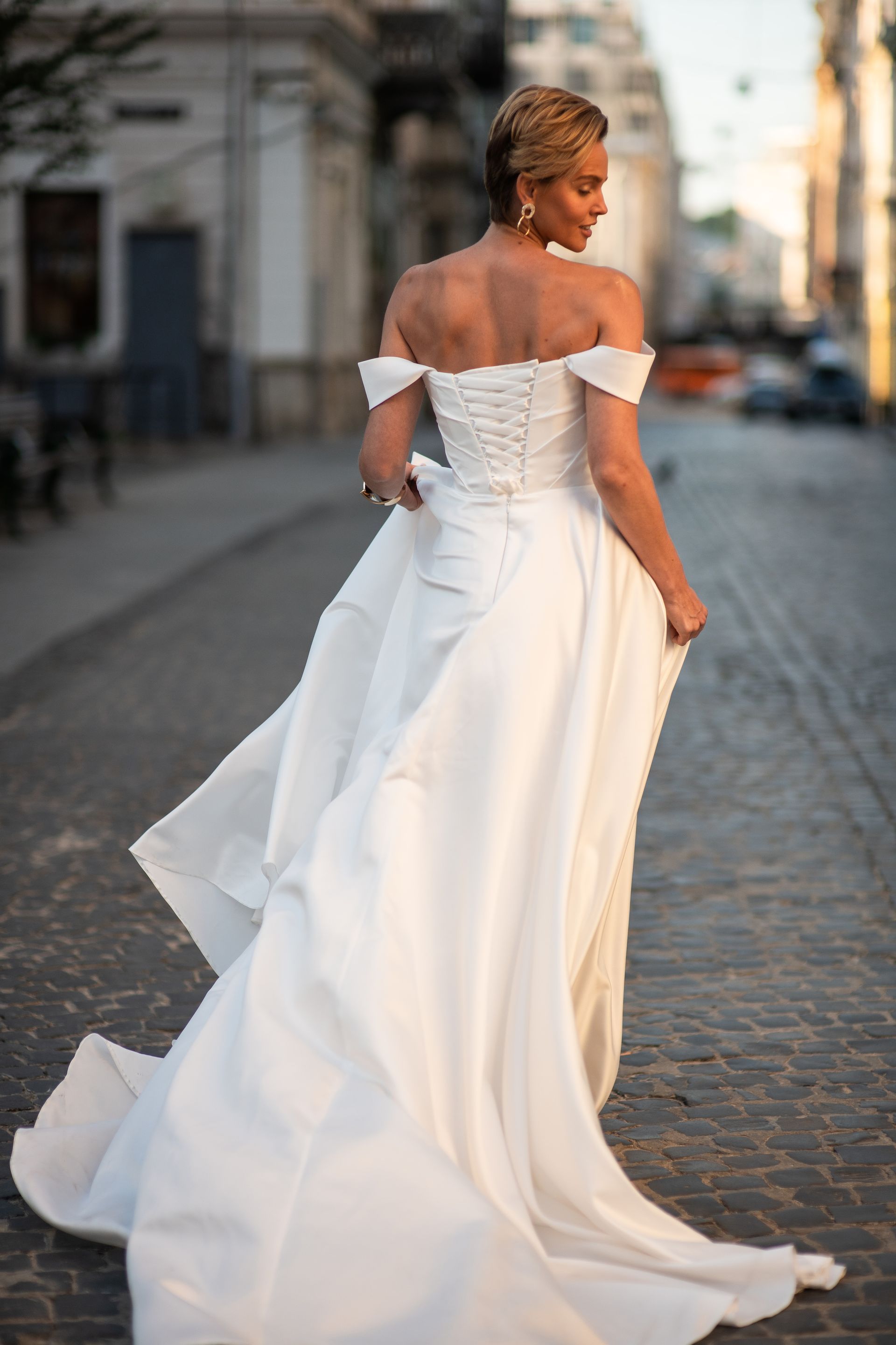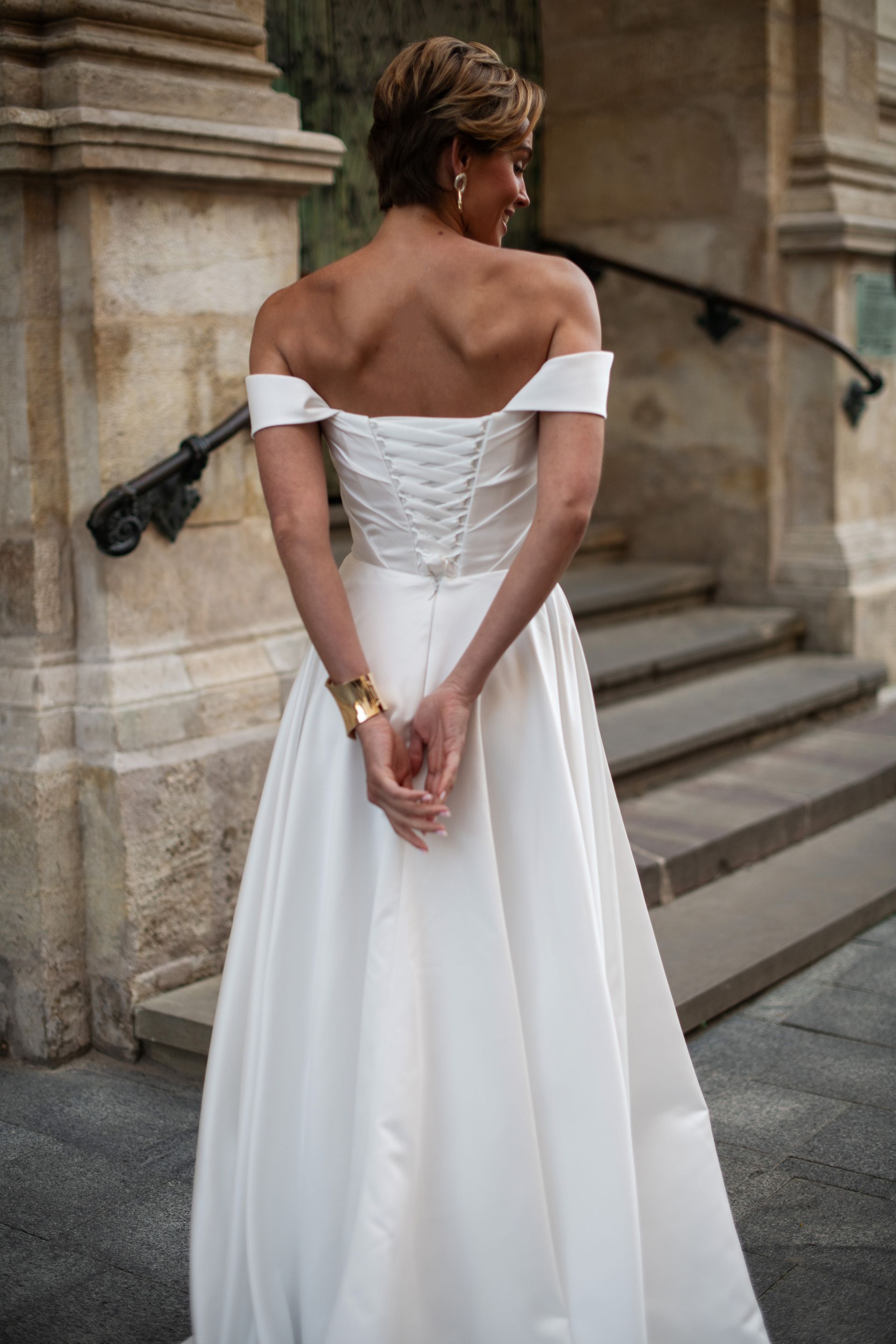 Satin A-line dress with satin draped bodice, detachable straps and corset back.